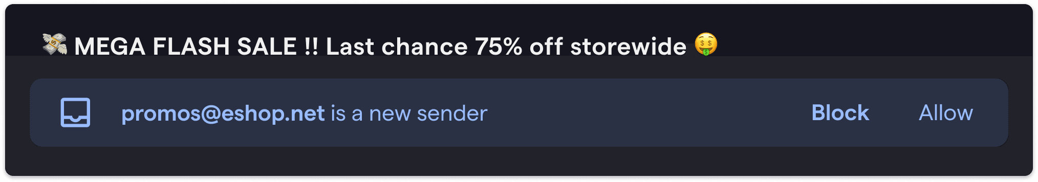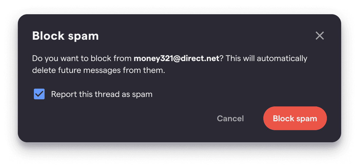Block spam is available on both web and mobile as a one-click way of simultaneously blocking a sender and marking a thread as spam. Blocking a sender automatically trashes all future messages from them, so they can never flood your inbox again.
