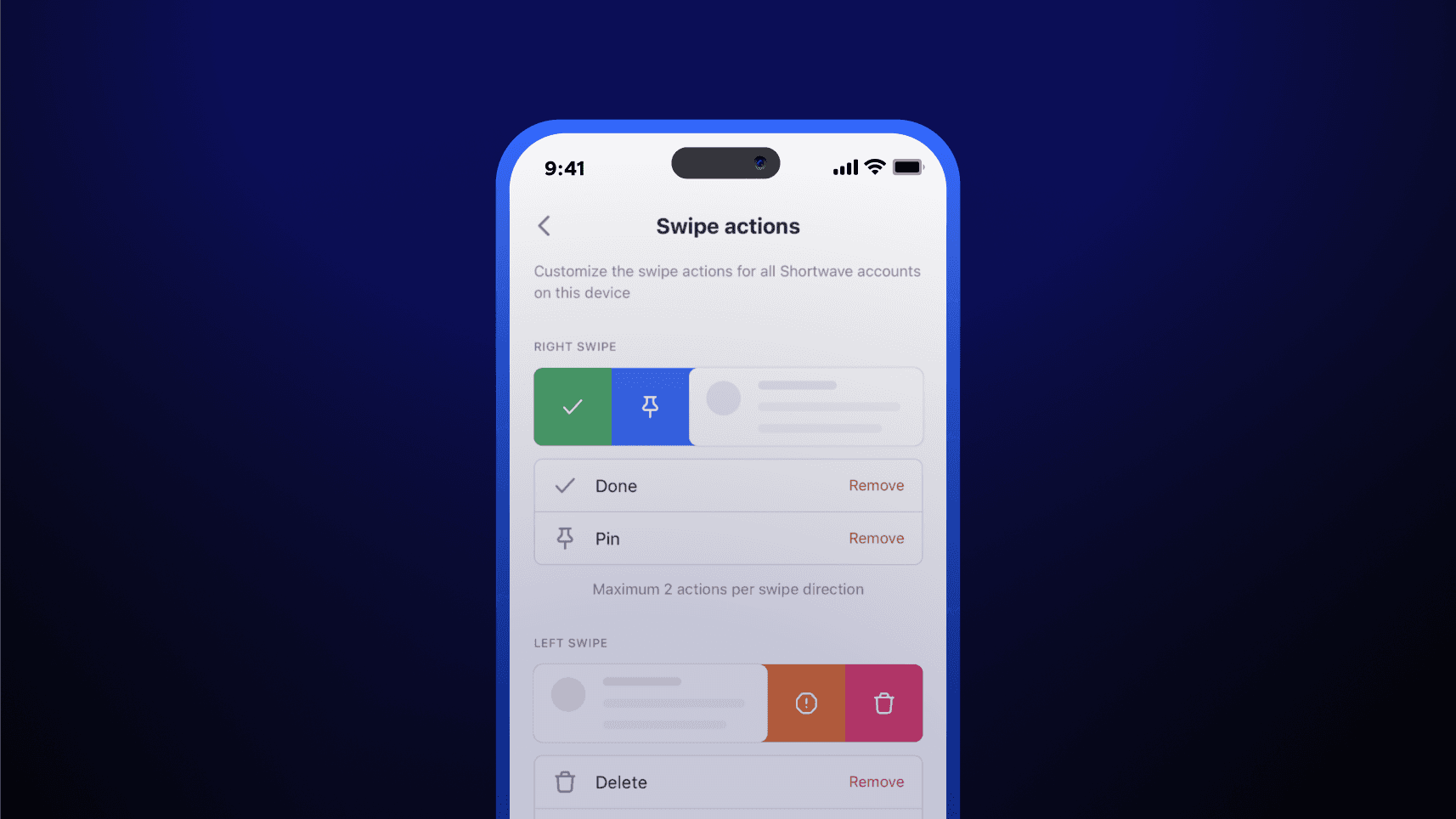 To customize your swipes, head to Settings > General > Swipe actions on your mobile device and modify or add new actions.