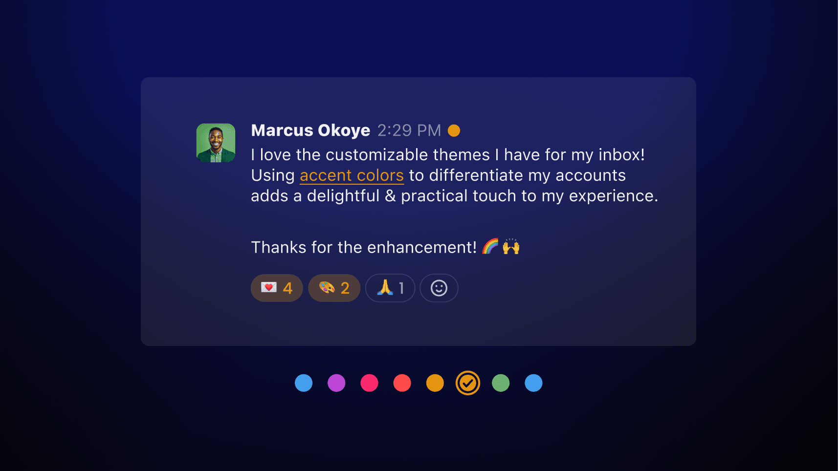 You can now try out a fresh coat of paint for your inbox! We've launched eight brand-new custom themes, and they're not just pretty to look at—they're designed with purpose. The warm colors like Berry, Fire, Sunset, and Honey liven up your Shortwave with a pop of extra contrast, whereas the cool tones like Forest, Glacier, Wave, and Amethyst add a touch of personalization while keeping things calm and focused. Every new accent color has been carefully crafted to look beautiful in both light and dark modes, giving you an environment that adapts to your needs, mood, and time of day. These themes also work on a per-account basis, meaning you can always tell what inbox you’re in from just a glance.
