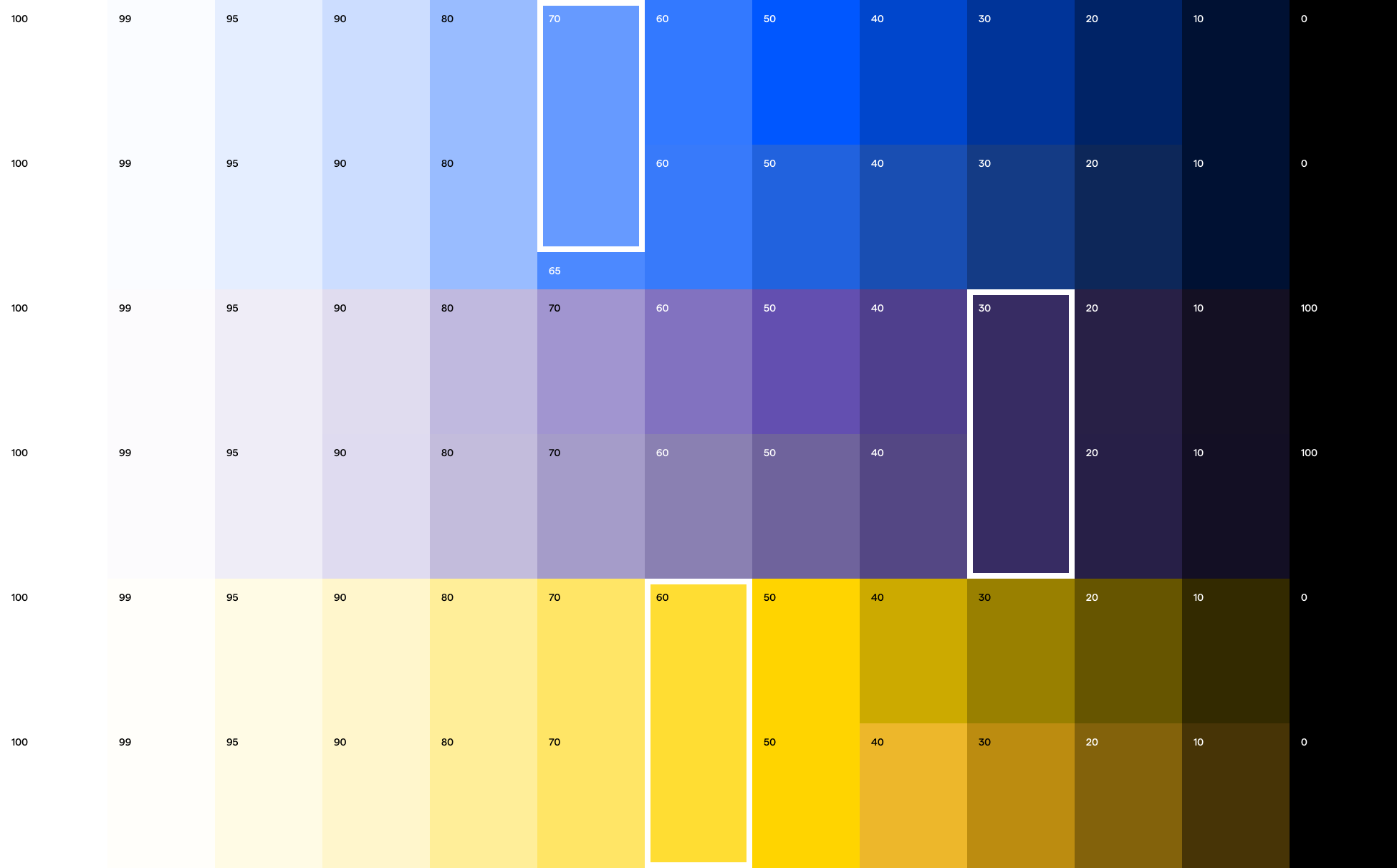 Starting with HSL tonal palettes derived from our brand colors, we manually adjusted some values to better align with our established style guide. We started with slight adjustments to saturation first. If that didn't cut it, we tweaked lightness next and then finally hue. For our blues and purples, we lowered the saturation to maintain our calmer palette. Our yellows were changed most drastically, as we adjusted hue, saturation and lightness across the palette to keep it cheery and avoid muddiness. Although small, these subtle tweaks make a huge difference in conveying the same mood across light and dark modes.