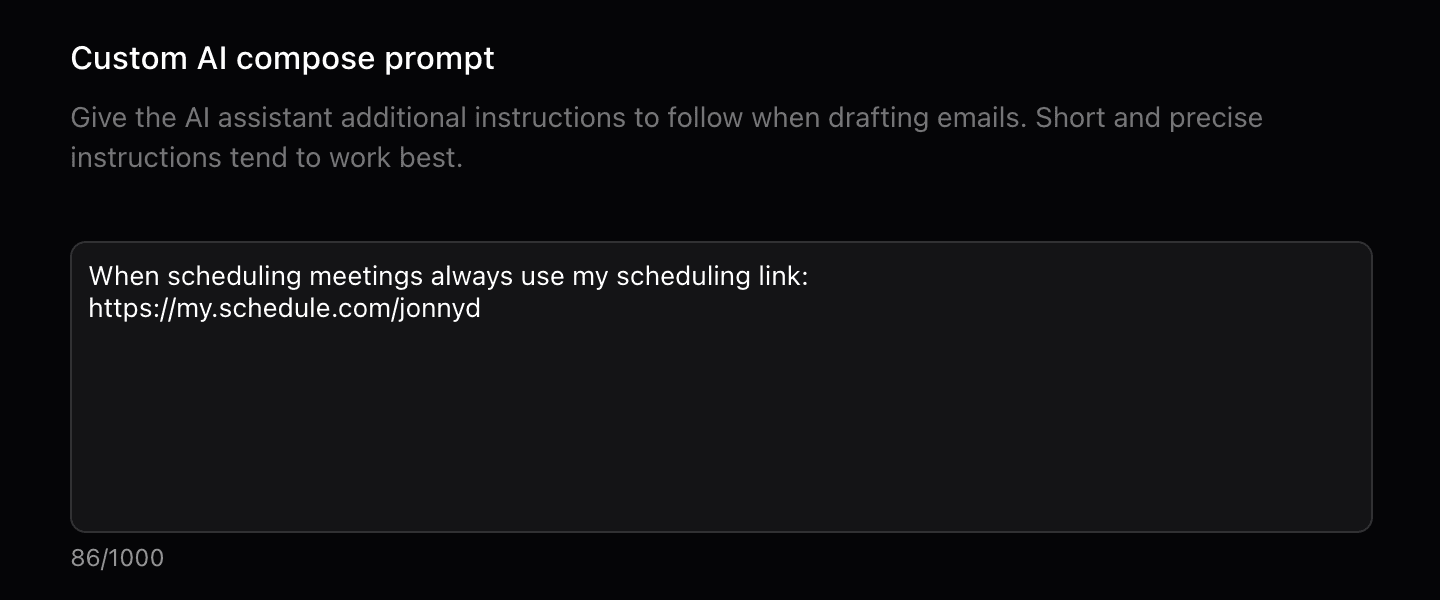 AI Autocomplete works together with our custom AI compose prompt setting so you can further control its behavior. For example, if you want it to always use your Calendly link, just add “When proposing meeting times always use this scheduling link: <LINK>”.
