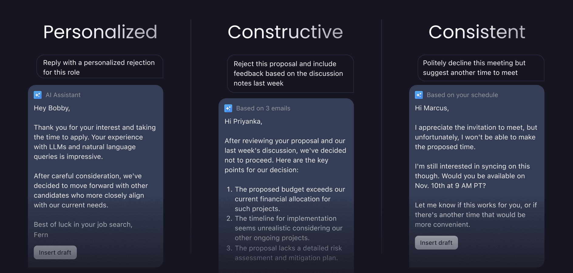 Shortwave is the best email app for handling these delicate replies because the AI Assistant will ensure your email is clear, polite, and professional. It's like having an executive assistant who understands the nuances of communication and can draft personalized replies in your writing style.