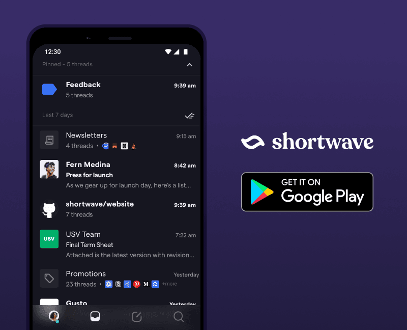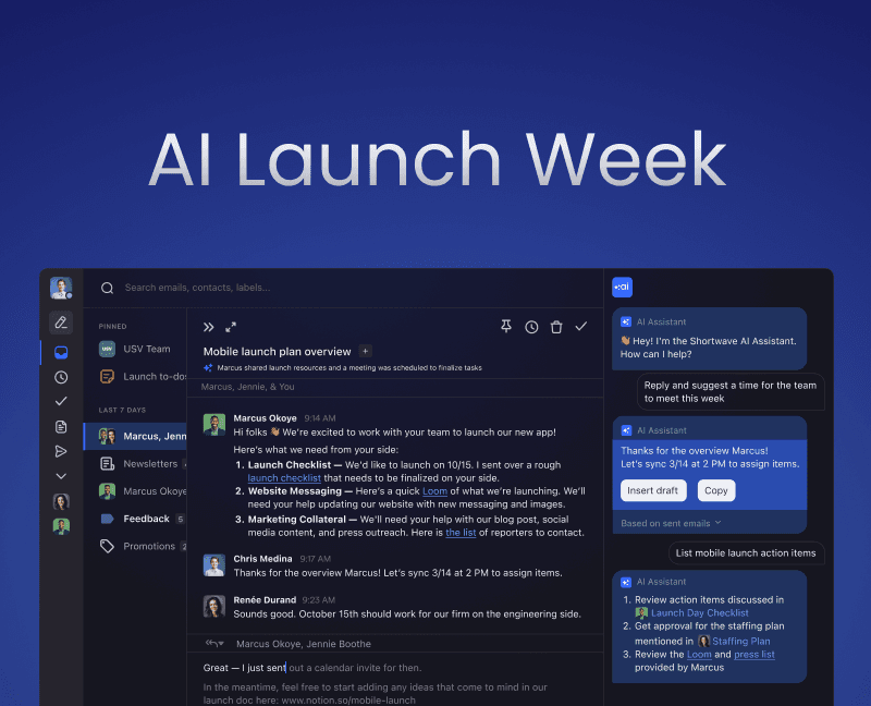 AI-native email for your team: Shortwave is evolving from an email app just for you, to an email collaboration suite for your entire team. Learn more about our new teams features below, or schedule a one-on-one call with our team.