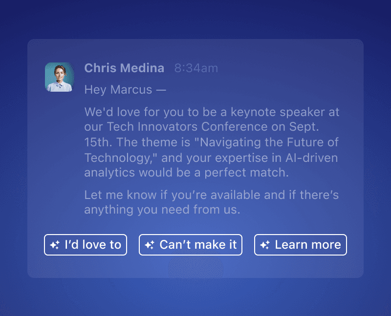 One-click responses: Instant AI replies are here to help you draft emails faster than ever — write a contextual reply using your unique voice and tone in a single click with simple inline suggestions.