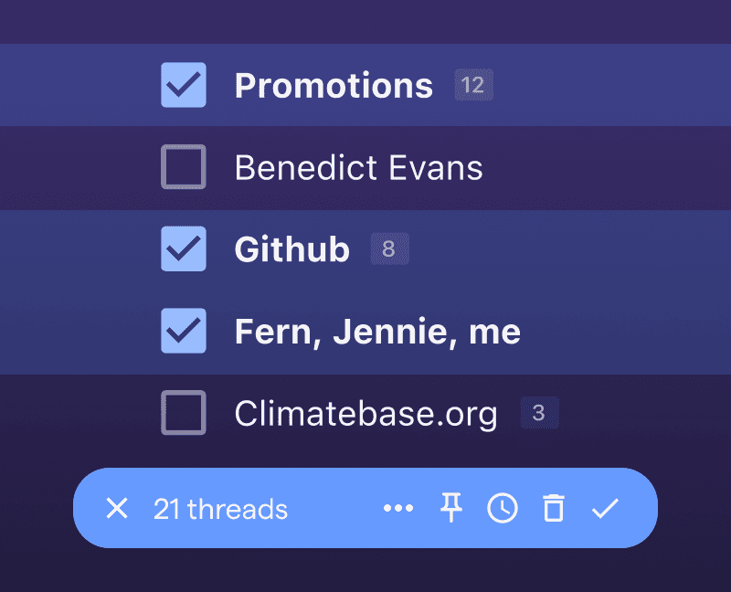 Reach inbox zero faster than ever: Select multiple emails at once to take bulk actions and quickly clear away clutter. You can also use shortcuts like x to select, shift+click to select a range, orcmd+click to select multiple individual items.