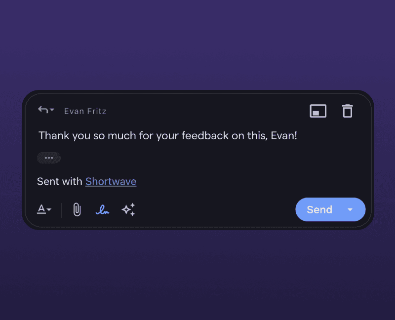 Sent with Shortwave: If you enjoy using Shortwave, you can let the world know by including “Sent with Shortwave” at the bottom of your messages. You can configure this from Settings > My account to append the tagline to your signature and help spread the love.